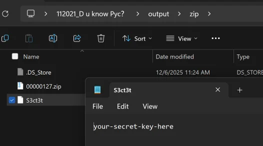 1bkcrack -C flag.zip -c attack_it.pyc -x 0 cb0d0d0a00000000 -x 12 83050000