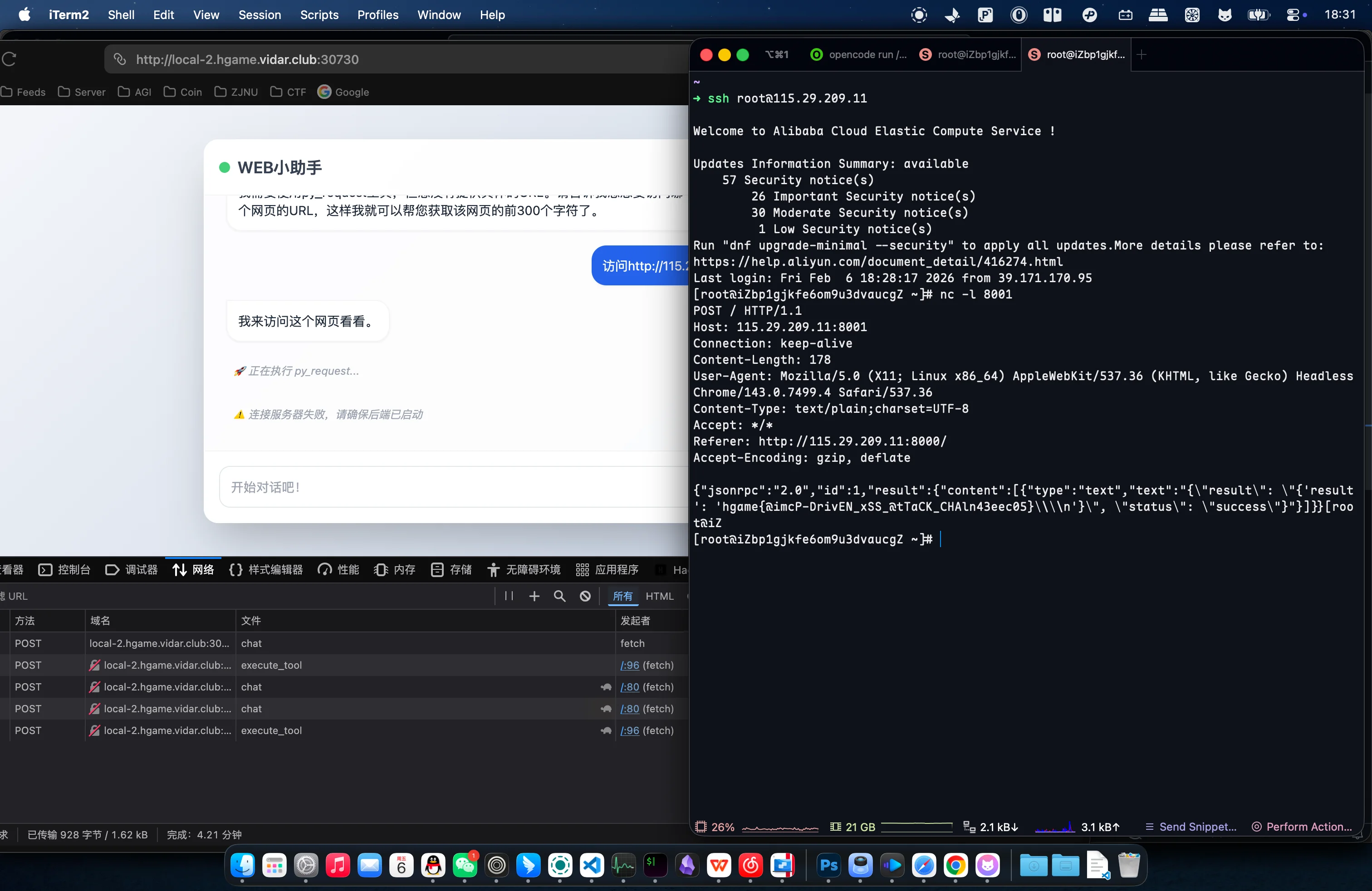 通过简单的对话和阅读源码得知有两个mcp:py_request和py_eval,但测试发现py_eval无法使用,“py_eval被管理员禁用了”,同时py_request不能以http开头,测试发现file://也不能用,但是观察到源码里额外设置了跨域的属性