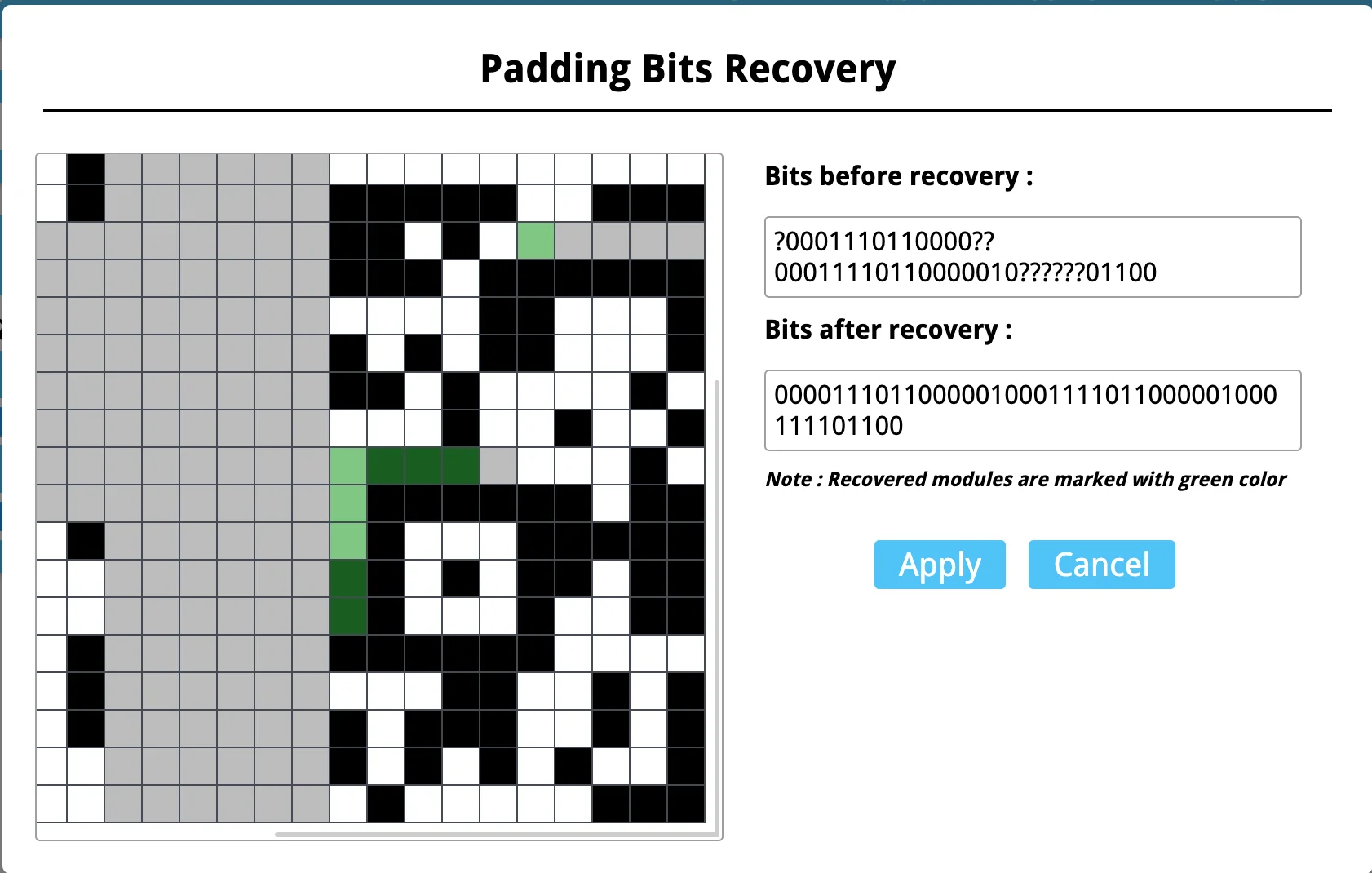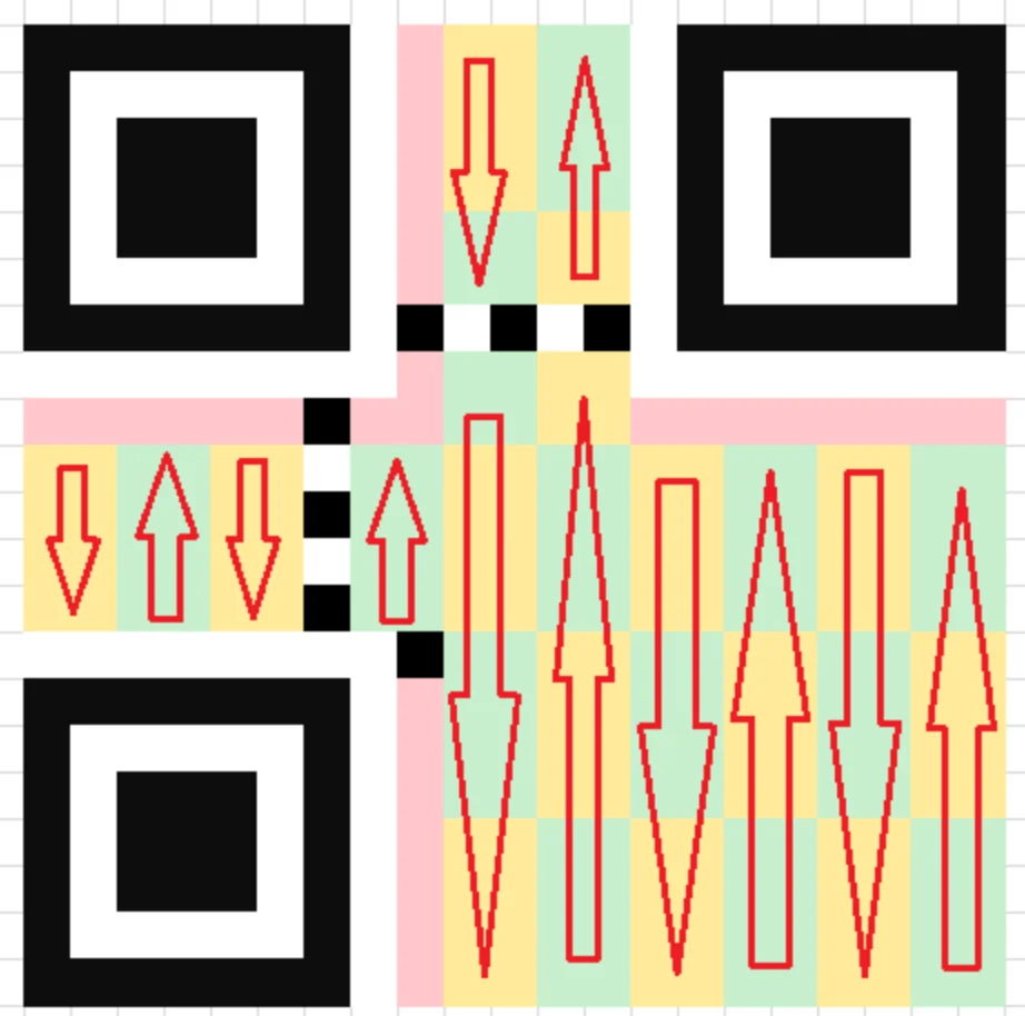 - 其余部分存储着原始数据(上图绿色)和纠错数据(上图灰色),填充顺序从右下角开始