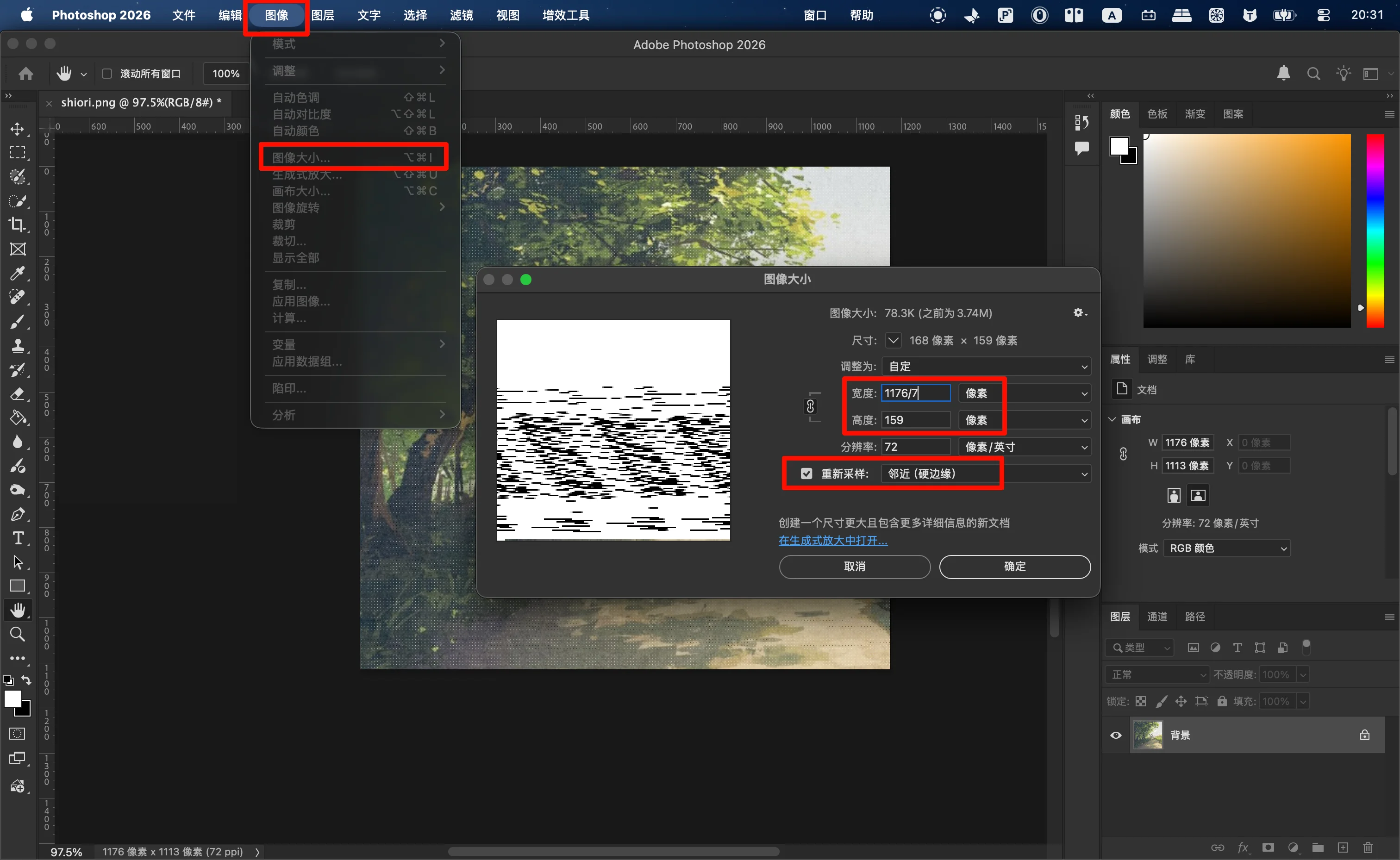 然后使用临近硬边缘算法缩放图片,观察到图片有很多杂乱的线条,推测是宽度被修改过