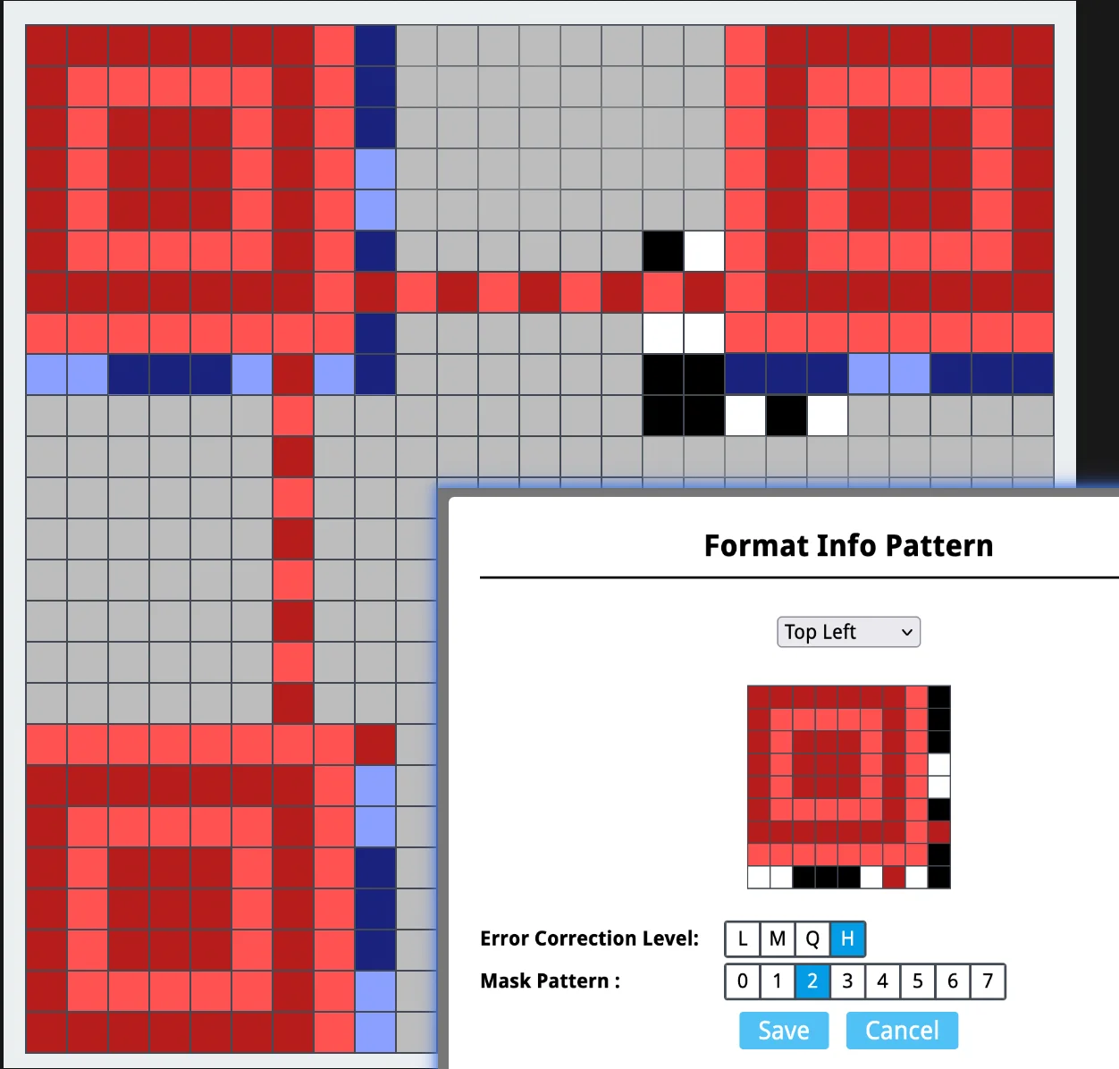 - 三个大定位图案附近(红色)存储着格式信息,包括纠错等级和掩码类别