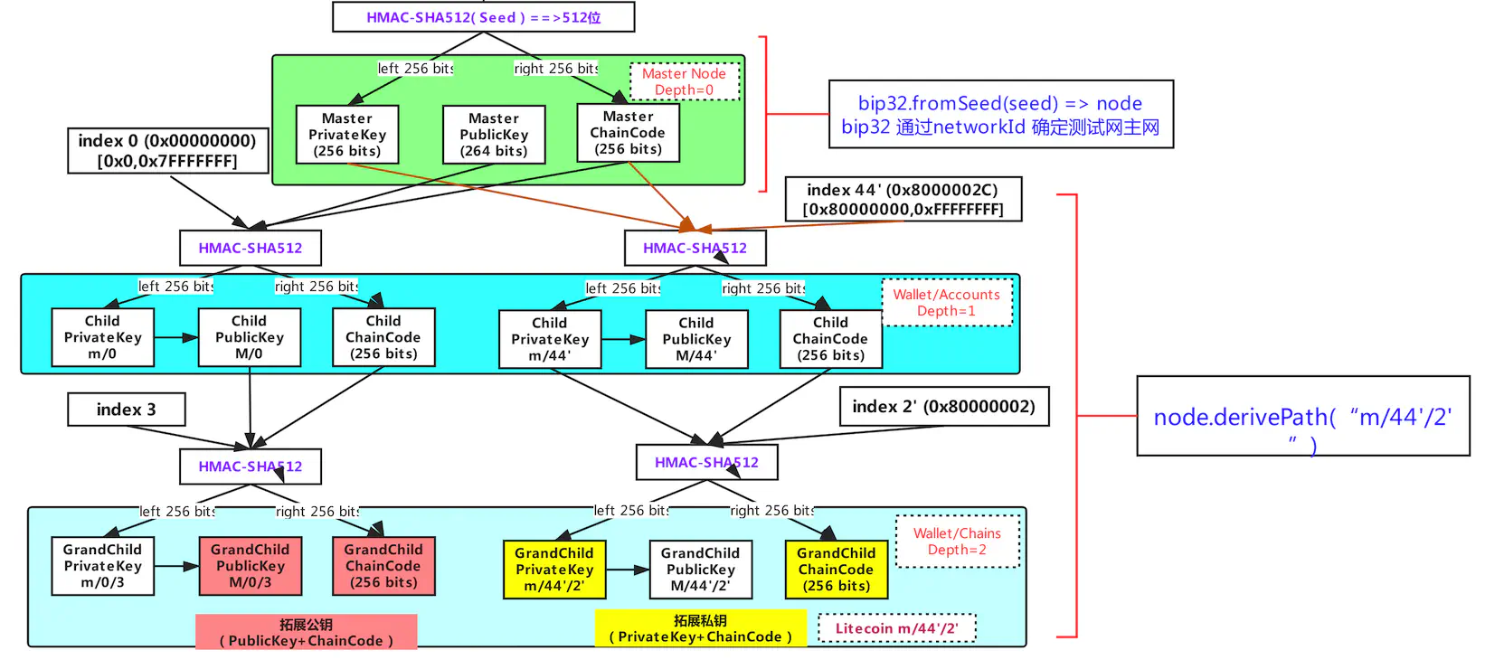 - Derivation Path (BIP-44): 相同的种子,在不同的推导路径下会产生不同的私钥。