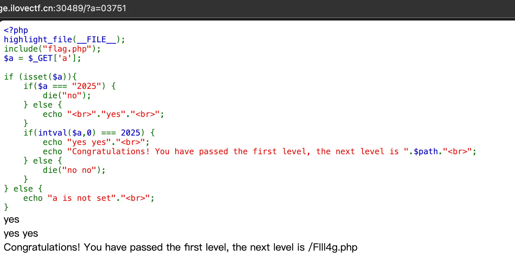 题目需要!$a === "2025" and intval($a, 0) === 2025